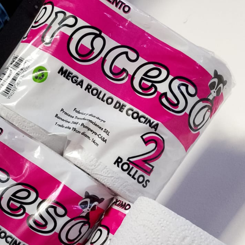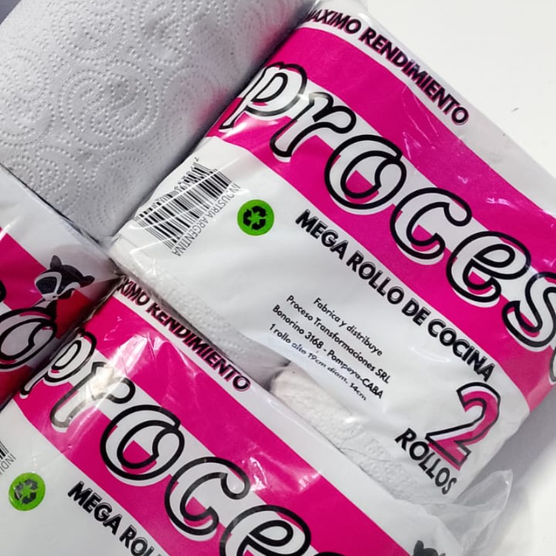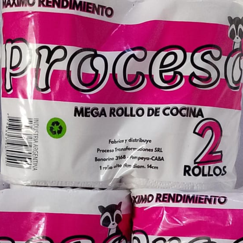 Rollo de Cocina Marca Proceso Económico de 2 Unidades de 200 Paños con Precorte realizado a partir de reciclaje enfocado a cuidar el ambiente.